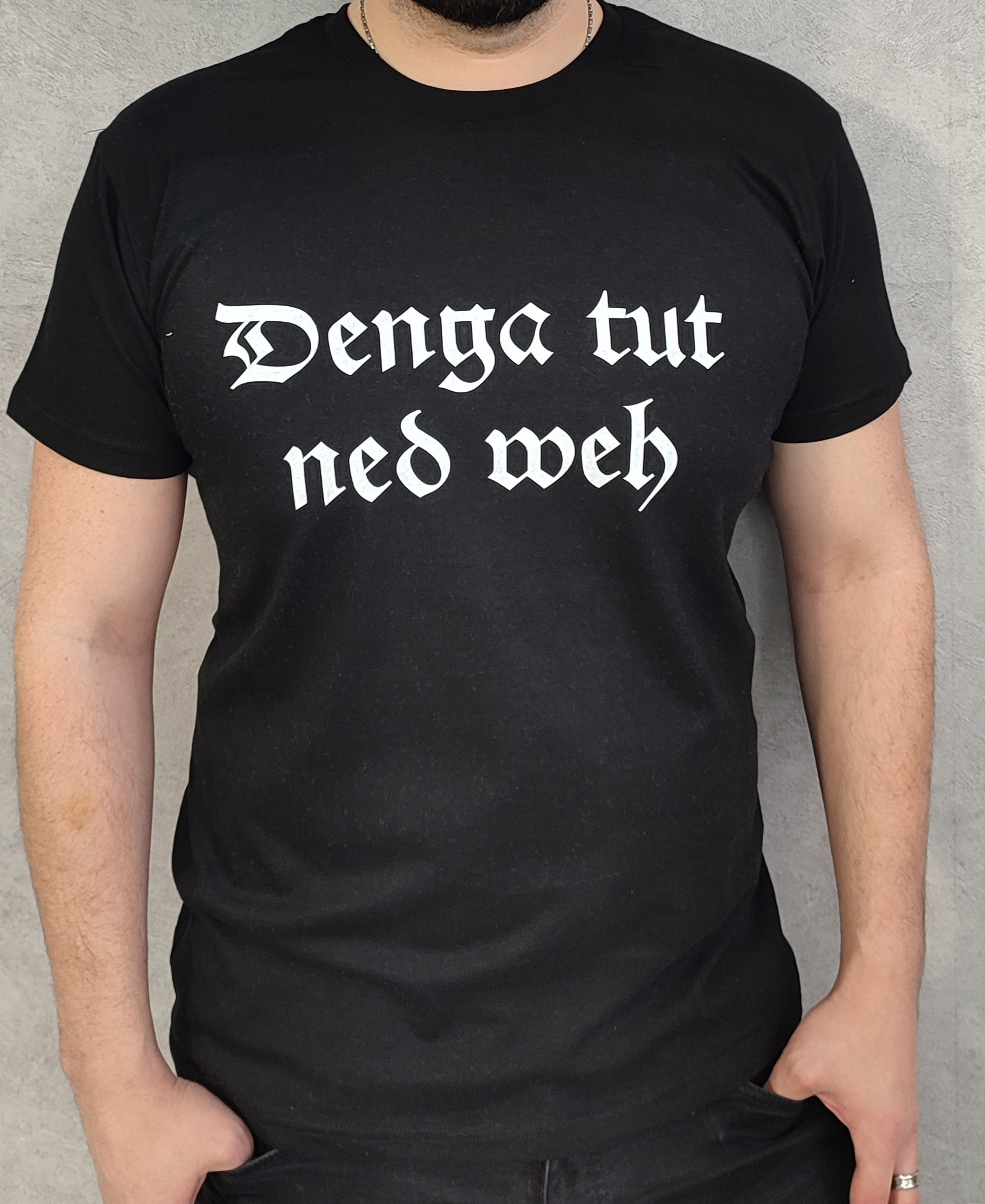 Der markante „Denga tut ned weh“ Schriftzug wird mittels hochwertigem DTF-Verfahren präzise auf die Brust aufgebracht.